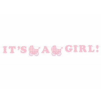 Søt banner til baby shower It’s a Girl er laget av kartongbokstaver festet sammen på hvitt silkebånd.