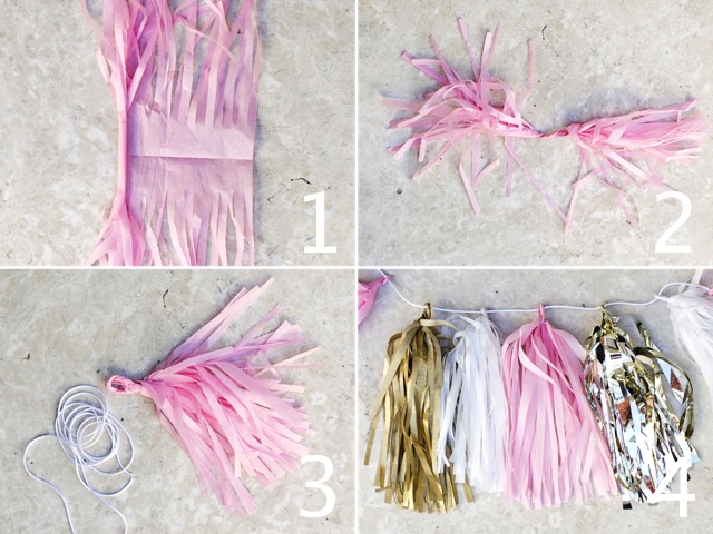 Tassels av silkepapir selges 5 stk. i pakken. Disse kommer flatpakket fra oss, men de er veldig enkle å lage (se DIY bildet til venstre). Du kan gjerne kombinere ulike farger for å skape din egen tassel girlander som vil passe perfekt til festens fargetema.