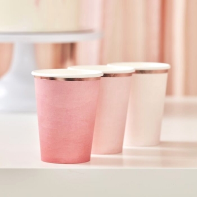 Nydelige pappkopper Ombre i gradient rosa farge og med roségull kant passer til servering av både kalde og varme drikker. En pakke inneholder 8 pappkopper med volum 9 oz (266 ml). Pappkoppene passer perfekt til en stilig bursdag, utdrikningslag eller en annen anledning.